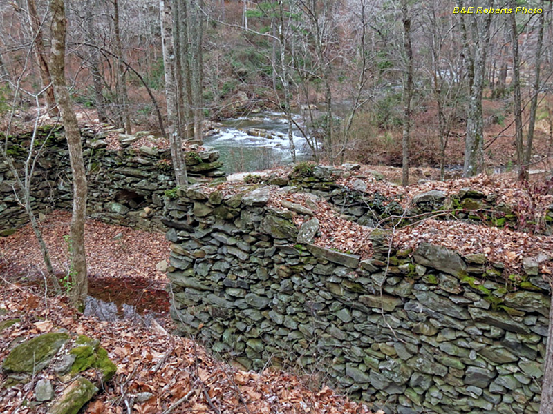 | One of several breached dams, and a section of stone-lined mill race / sluice. |