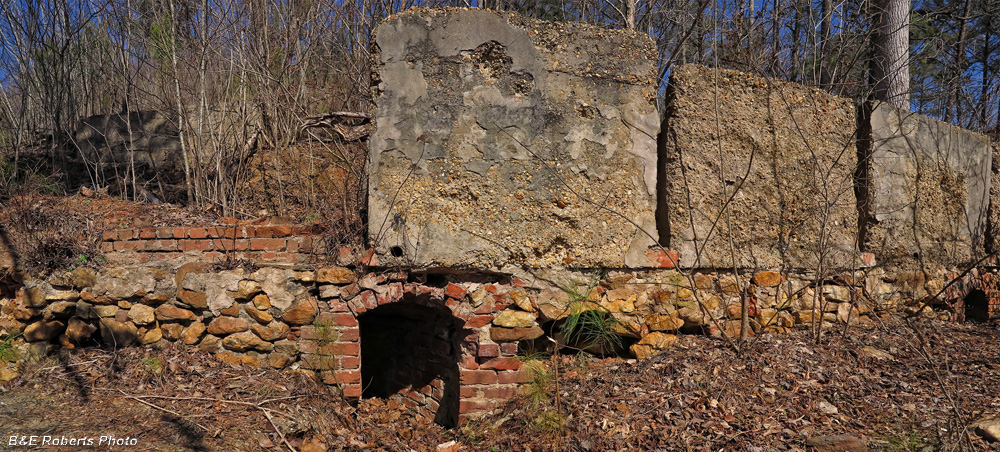The Cherokee Gold Mine One of a group of six gold mines near Sixes in Cherokee Co., this mine was worked as early as 1854 and included stamp mills, a concentrating table, & a cyanide plant. Areas of this property were alternatively known as the McConnel and Williamson Mines. South Complex: The remains of the mining processing operations are found in two distinct areas. The southern-most area borders the current shoreline of Lake Allatoona. This was likely part of the Williamson mine operations. |