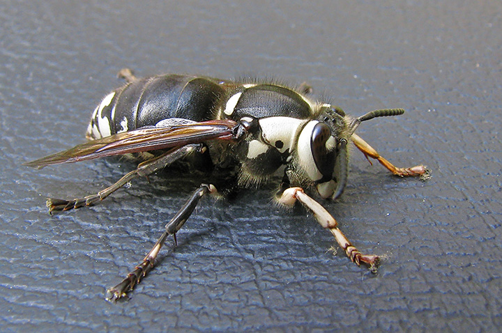 | Red wasp gnawing off piece of wood to chew into paper for nest |