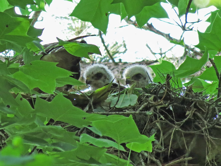 | In early 2014, a pair of Red-Shouldered Hawks started building a nest high up a poplar tree in our yard. They subsequently hatched, raised and fledged two young hawks. |