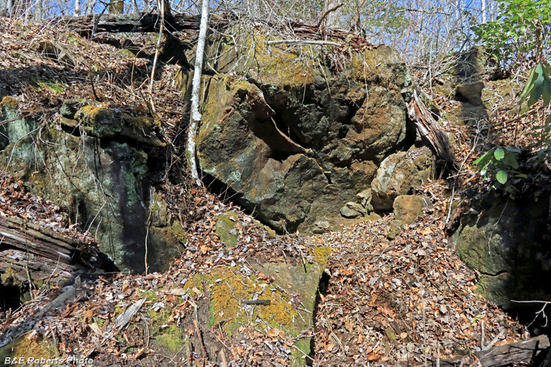 A number of mine cuts were excavated on the mountainside west of the Herbert Mine. While some were little more than prospect pits, there was one large open cut, and a big (now mostly collapsed) shaft. These un-named works were not reopened by the Bureau of Mines during their WWII prospect work.
