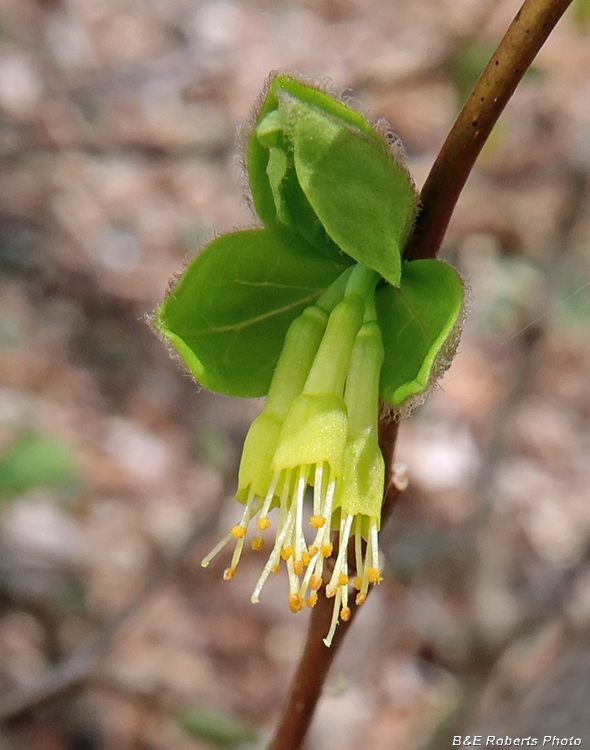 | Flowers of Eastern Leatherwood (Dirca palustris) This species doesn't seem to be common; this was the first time I had photographed it. |